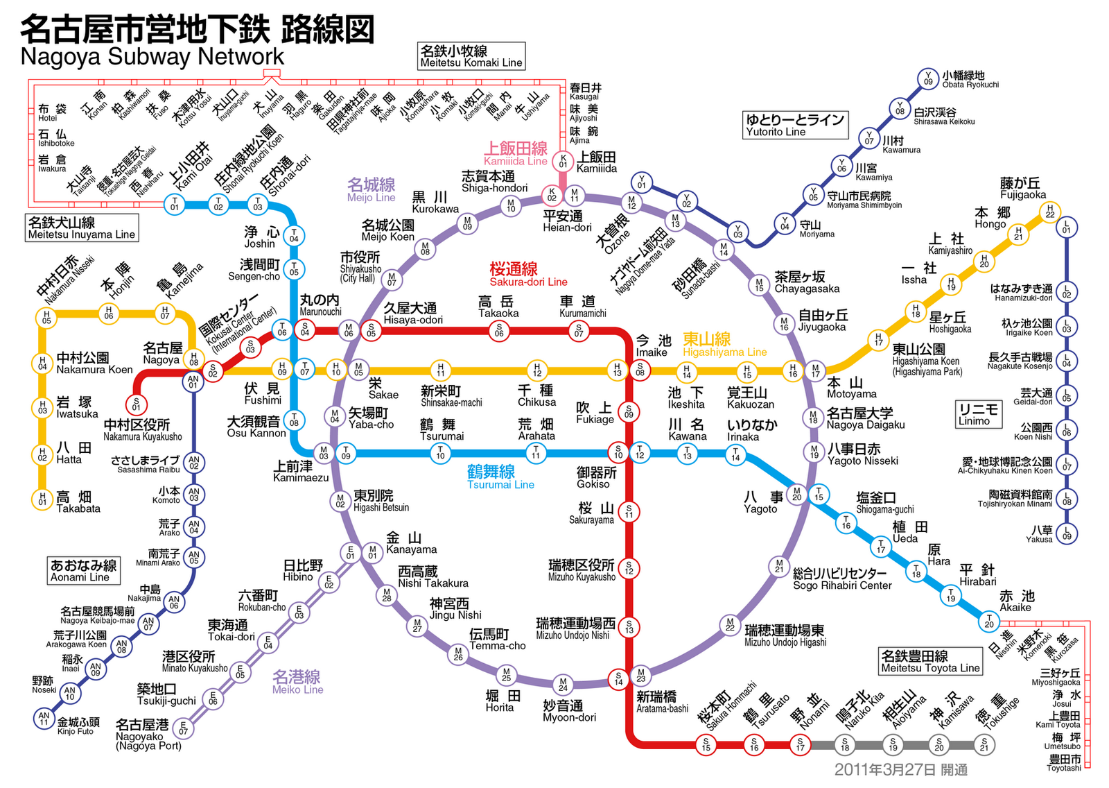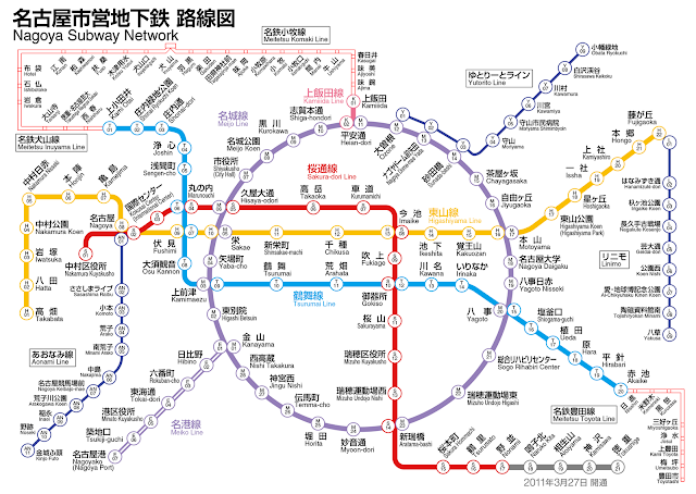 Autre aspect très pratique de la vie japonaise: les transports! Ceux-ci sont chers mais toujours propres et toujours à l'heure ce qui est très appréciable. Le Japon est le meilleur réseau férré du monde ce qui permet d'aller à peu près partout avec le train. Et pour les petits budgets, les principales liaisons sont aussi desservies par des bus discount! Le métro est également assez exceptionnel. Ci-dessous le métro de Nagoya, 4ème ville du Japon, c'est autre chose que le réseau lillois ou bordelais...